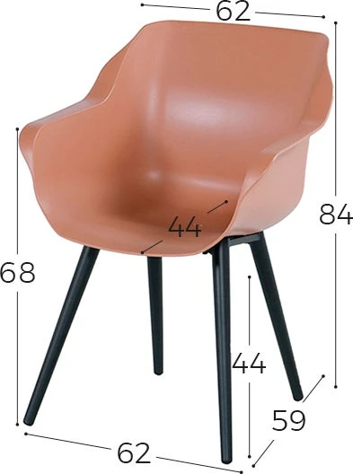 Kuipstoel Sophie Studio heeft de afmetingen 59 x 62 x 84 cm. Zithoogte 44 cm, 5 jaar garantie.