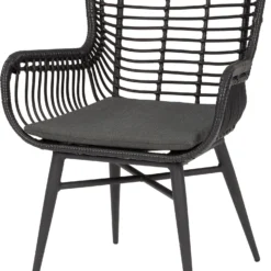 Deze Hanna eettafelstoel van Intratuin in hippe retro stijl is een lust voor het oog. Eettafelstoel Hanna is fraai vormgegeven met een knipoog naar grootmoederstijd en vervaardigd uit een mat zwart gecoat frame van aluminium met een zitting van geweven wicker in de kleur zwart. Dit materiaal met de looks van natuurlijk riet of rotan staat bekend om zijn lange levensduur.